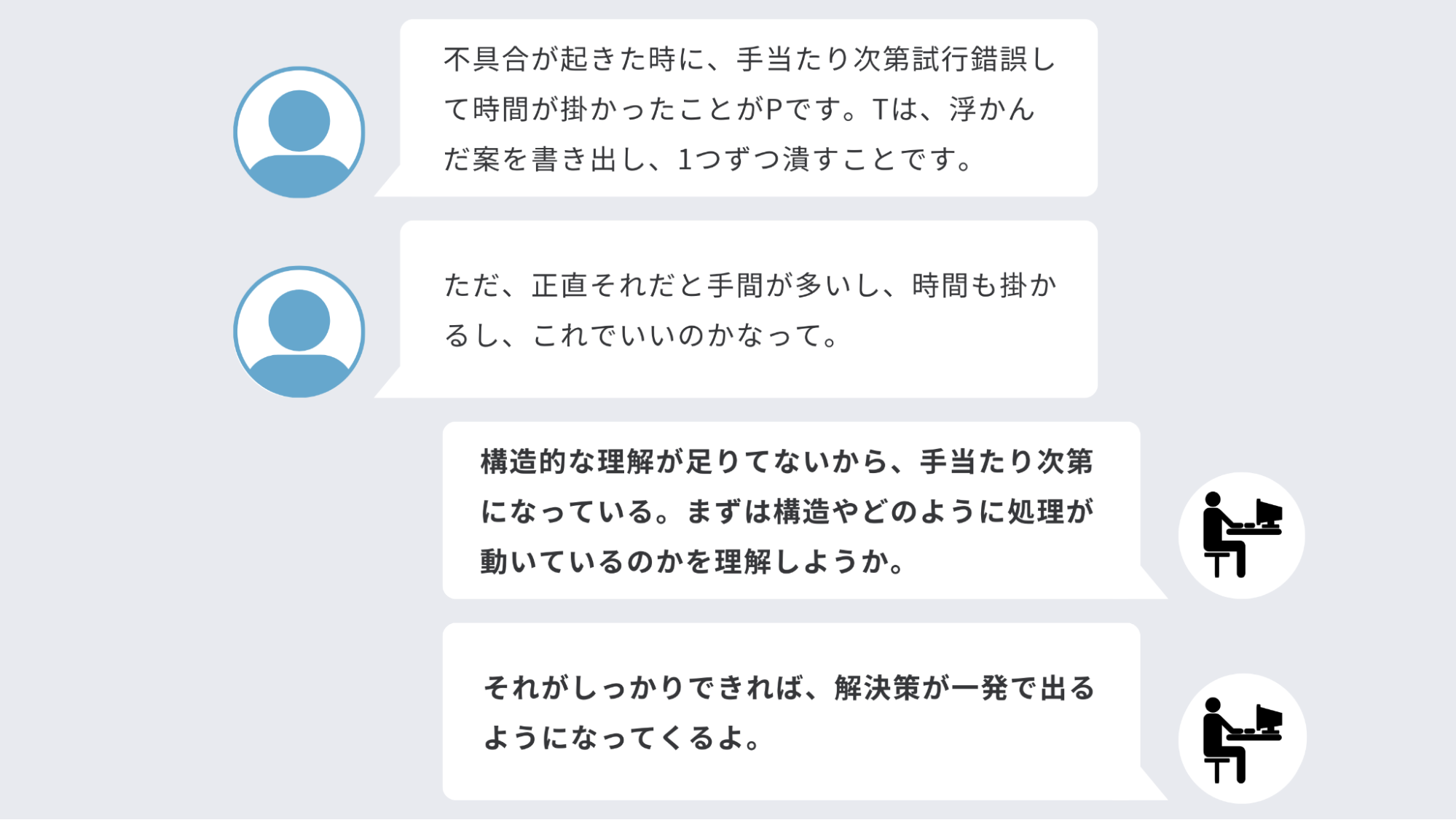 ただ、いきなり一人だけでその境地までたどり着くのは難しいため、若手メンバーは「鏡役」としてベテランプログラマを相手に、時間をかけて内省スキルを鍛えていくことになります。そうやって、経験をもとに学び、自分で考え、改善する力が付いていけば、創造性を発揮できるようになり、再現性のない仕事でも成果を出せるようになっていくのです。